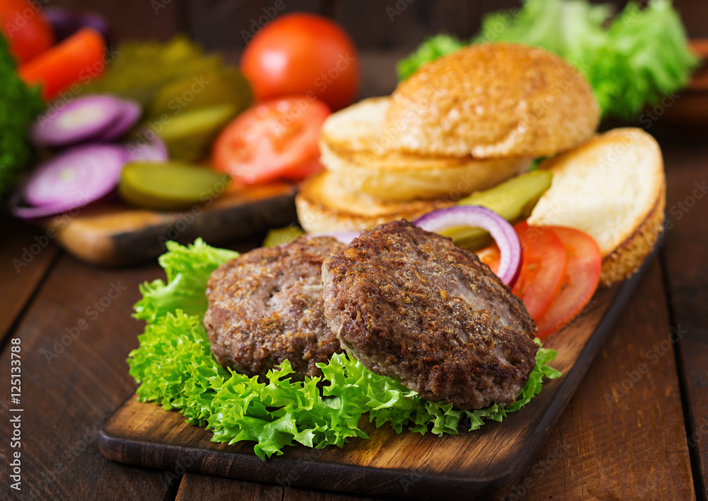 Ingredients for a sandwich - hamburger burger with beef, pickles, tomato and red onion on wooden background.