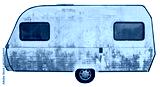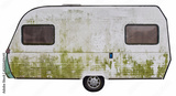 A large, white, slightly dirty travel trailer with moss on the sides and windows. The texture of the paint is visible in places. Isolated on a white background.