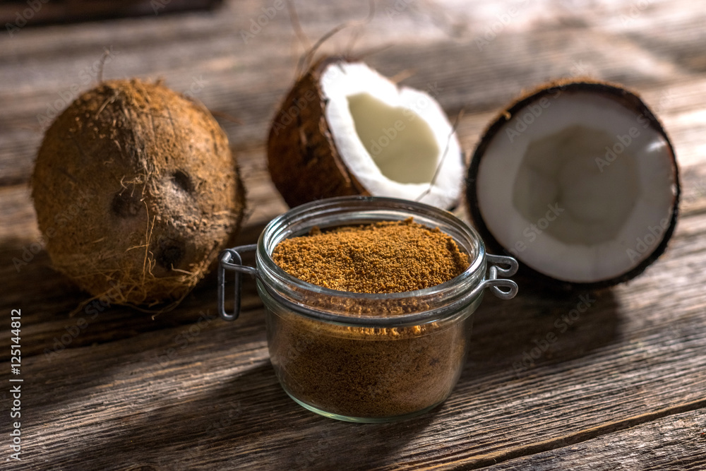 Coconut palm sugar on rustic wooden background