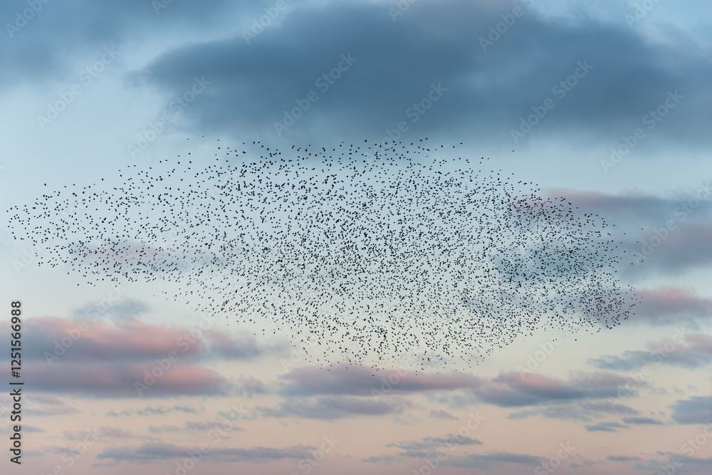 Amazing image of starling murmuration in flight during pastel colour Winter sunset evening