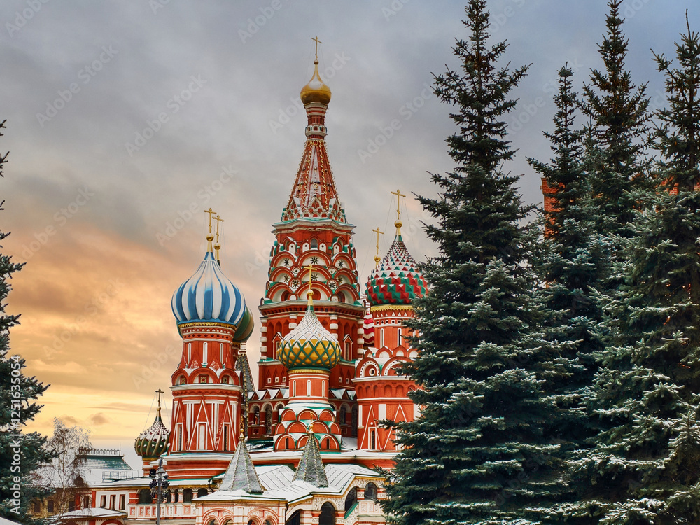 Majestic St. Basil's Cathedral against a winter sunset with towering pine trees
