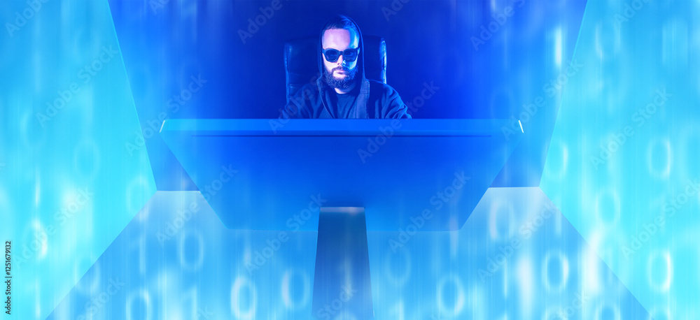 Hacker develops program code. Man cyber developer. Programmer near large monitor. Hacker in hood and sunglasses. Binary code around digital criminal. Man hacker in blue room. Virus ddos attack