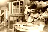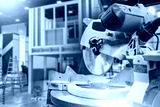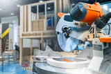 Stationary circular saw. Equipment for construction and repair. Circular saw for installation of wooden structures. Construction technologies. Stationary circular saw with steel blade