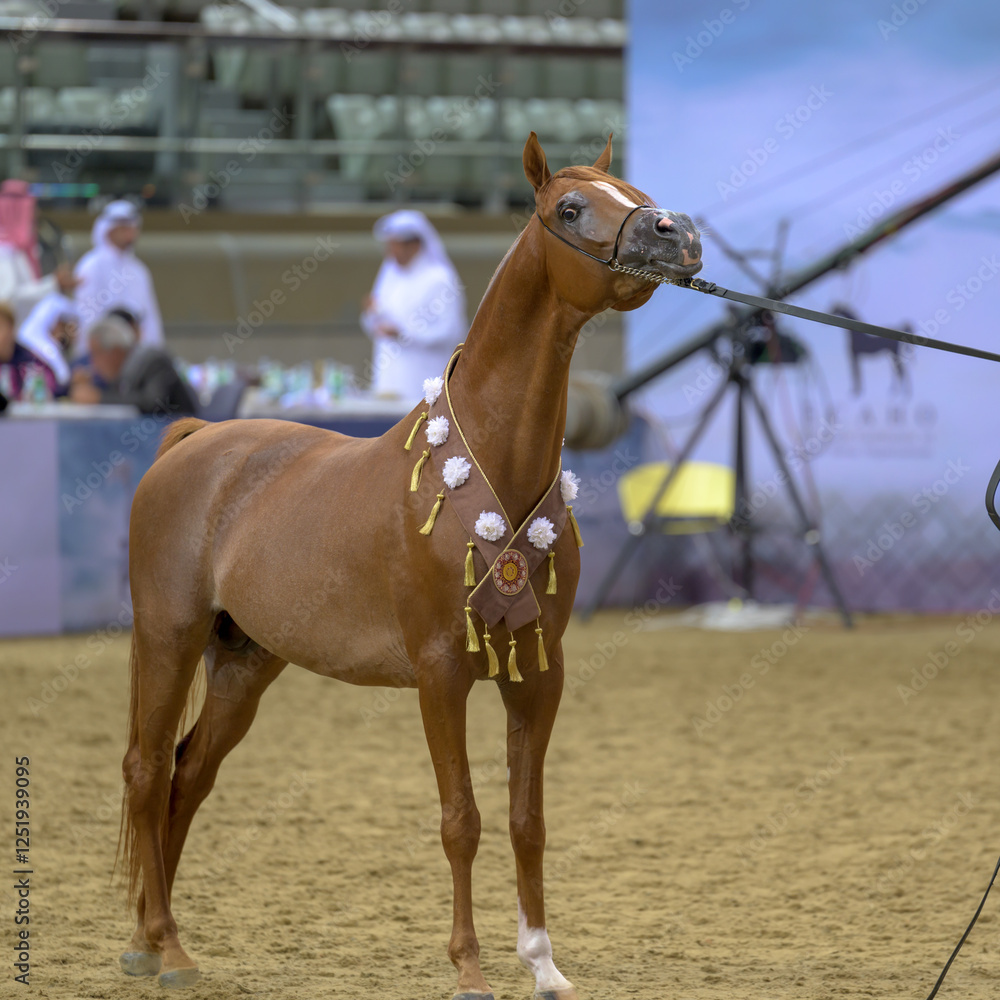 Doha Qatar October 27.2023: Side view of an Arabian horse standing at the Thoroughbred Arabian Horse Festival.