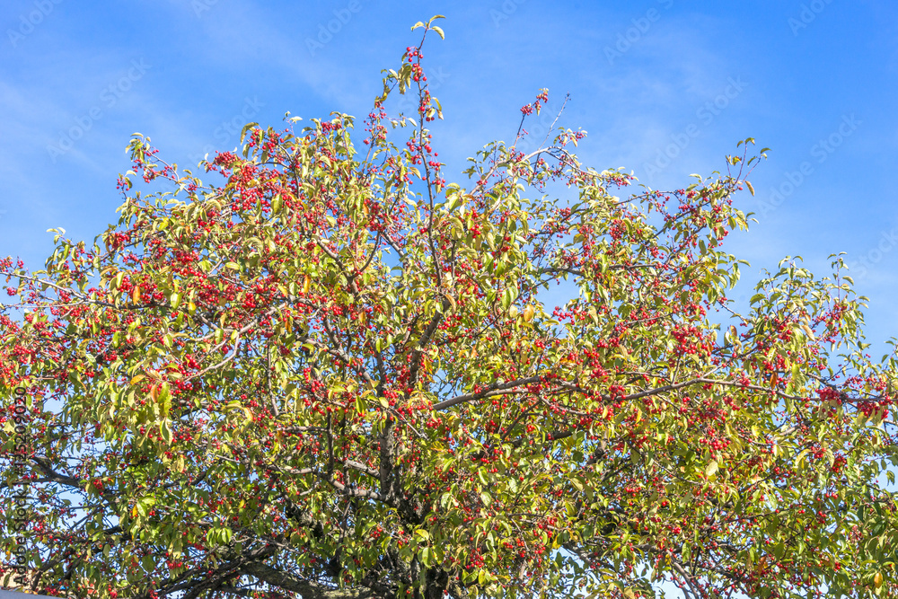 Autumn tree bursting with tiny red berries against a deep blue s