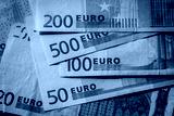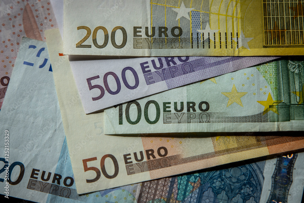 Close up of a pile of Euros bills in various denominations wirh the word Euros showing