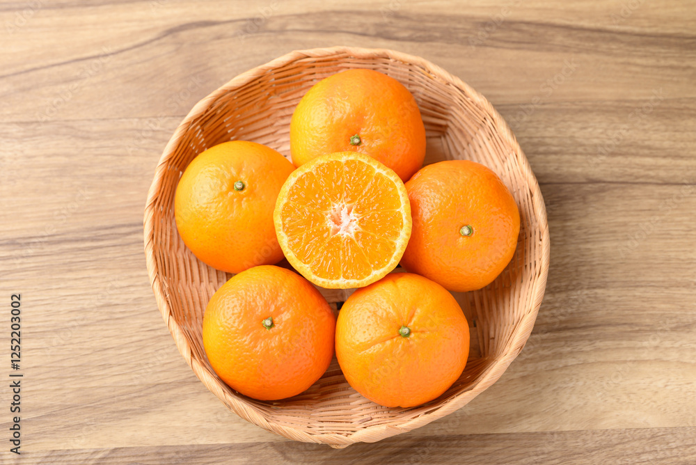 Mandarin tangerine orange fruit in basket on wooden background, Table top view