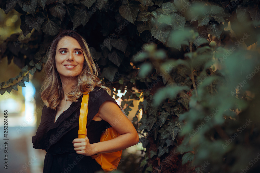 Fashionable Woman with Wavy Hair Enjoying Walking Outdoors. Sophisticated and elegant lady feeling carefree and positive