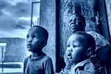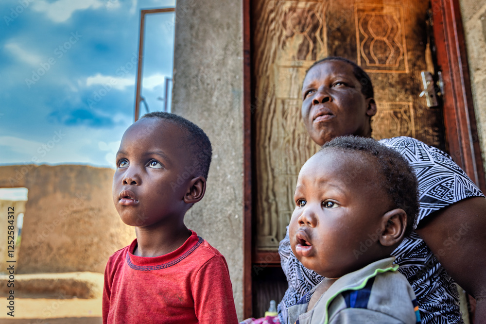 African village , granny and kids , playing in front of the door of the shack house in the yard, daily life in the ghetto