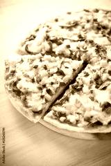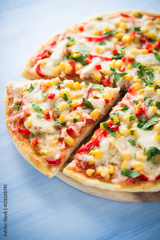 Colorful sliced pizza with mozzarella cheese, chicken, sweet corn, sweet pepper and parsley close up. Italian cuisine.
