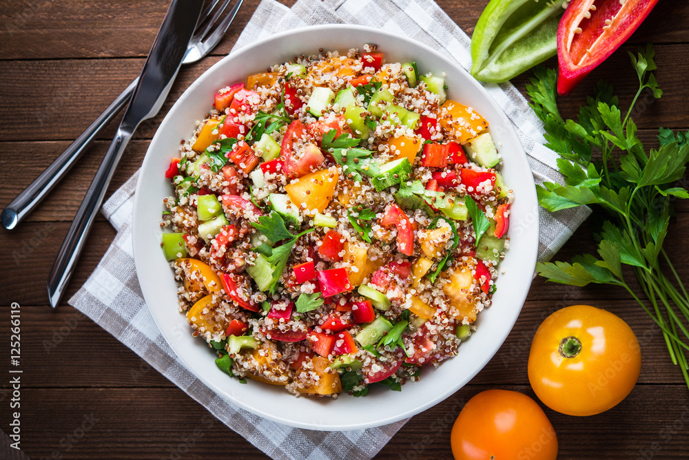 Fresh healthy salad with quinoa, colorful tomatoes, sweet pepper, cucumber and parsley on wooden background top view. Food and health. Superfood meal.