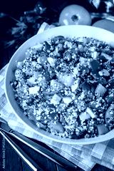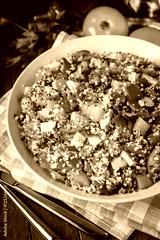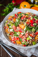 Fresh healthy salad with quinoa, colorful tomatoes, sweet pepper, cucumber and parsley on wooden background close up. Food and health. Superfood meal.