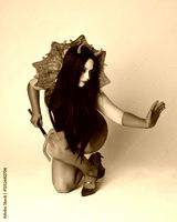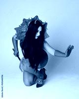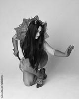 portrait of female pin-up model wearing elegant red dress with gothic fantasy burlesque halloween themed devil costume, horns & gloves. isolated sitting pose holding pitchfork on studio background