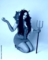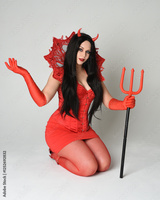 portrait of female pin-up model wearing elegant red dress with gothic fantasy burlesque halloween themed devil costume, horns & gloves. isolated sitting pose holding pitchfork on studio background