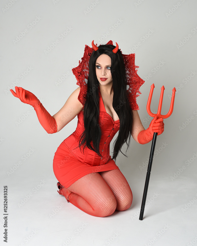 portrait of female pin-up model wearing elegant red dress with gothic fantasy burlesque halloween themed devil costume, horns & gloves. isolated sitting pose holding pitchfork on studio background