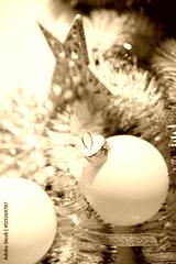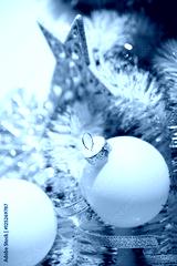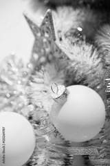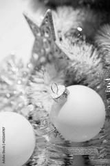 White xmas ornaments close up. Merry christmas card. Winter holidays. Happy New Year.