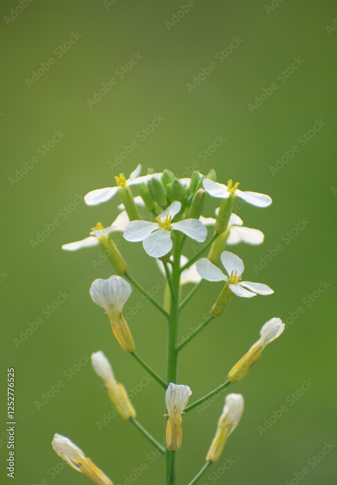 Wild radish plant with broad green leaves and delicate yellow flowers thriving in a natural meadow.