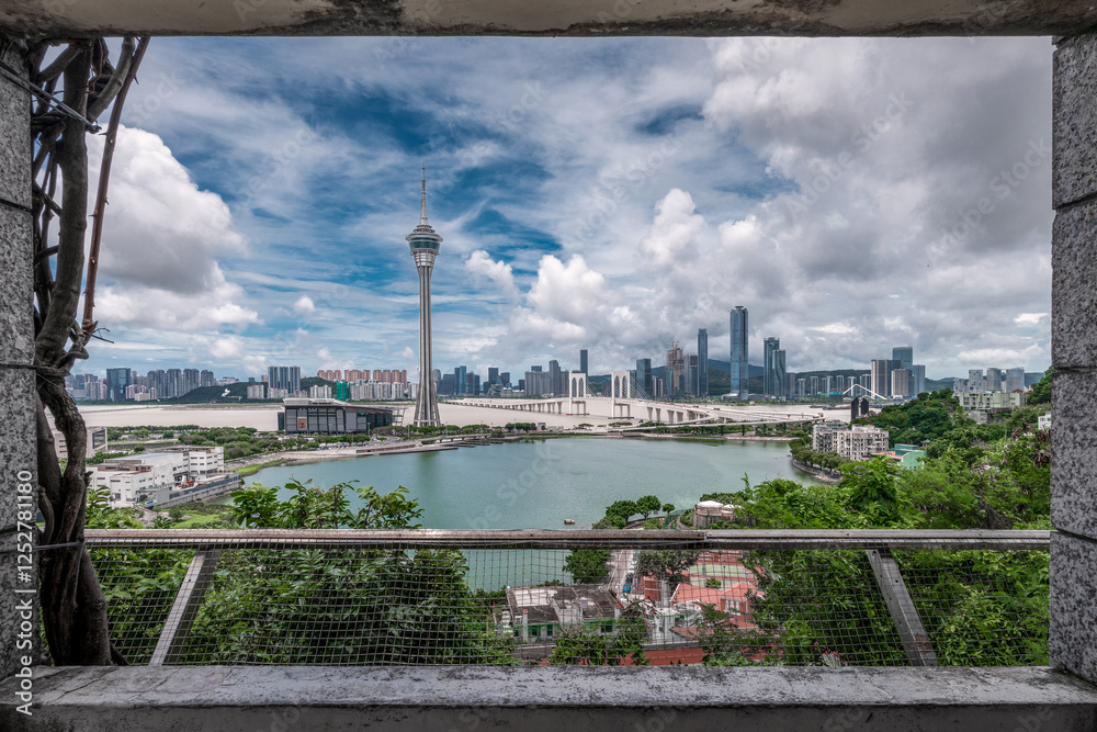 panorama of the Macau Tower in the city of Macau in a frame with blue sky and cloud