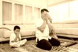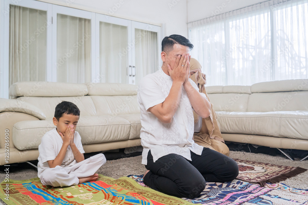 Muslim Family Concluding Prayer – Father, Mother, and Son Wiping Face After Dua