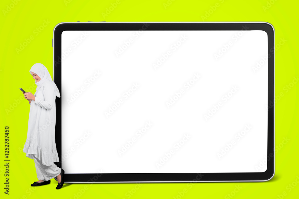 Muslim Woman Using Smartphone Next to Large Tablet Screen with Blank Space