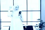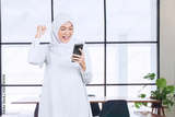 Excited Muslim Woman Celebrating Success While Using Smartphone in Modern Office