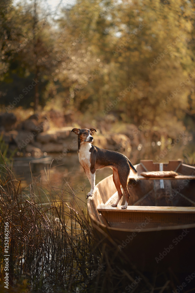 A Jack Russell Terrier standing tall in a wooden boat as golden light surrounds the area. The scene showcases the dog's confidence and the natural charm of the riverside location.