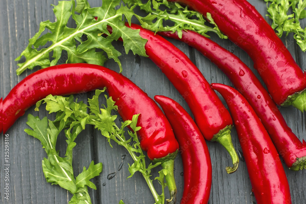 chilli peppers and arugula, lying horizontally