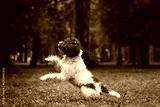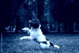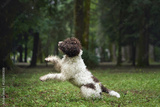 A Lagotto Romagnolo runs energetically on a grassy field in a forest. The playful moment is framed by a lush green background and natural light.