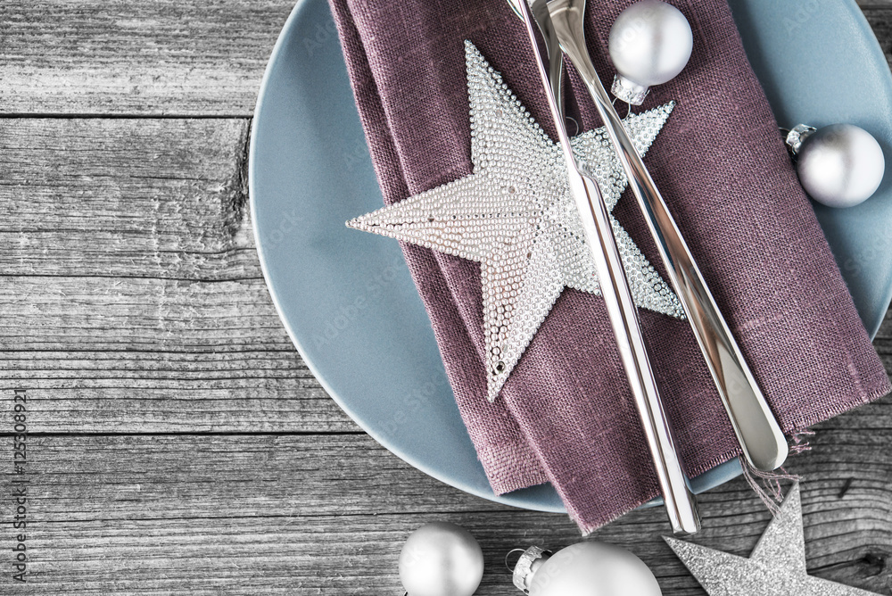 Christmas plate decoration with xmas ornaments on old wood background. Winter holiday theme. Happy New Year. Space for text.