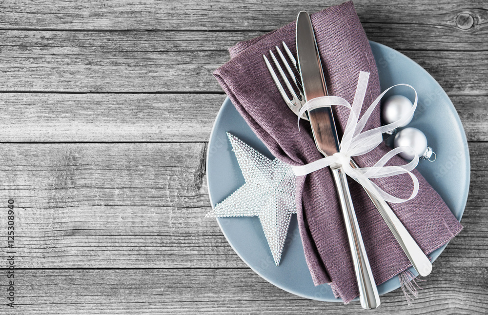 Christmas plate decoration with xmas ornaments on old wood background. Winter holiday theme. Happy New Year. Space for text.