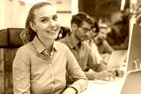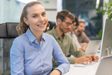 Attractive positive young businesspeople and colleagues in a call center office.