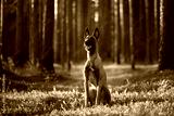 A Belgian Malinois sits gracefully in the warm glow of a forest. The serene composition highlights the harmony of the dog with its natural surroundings.