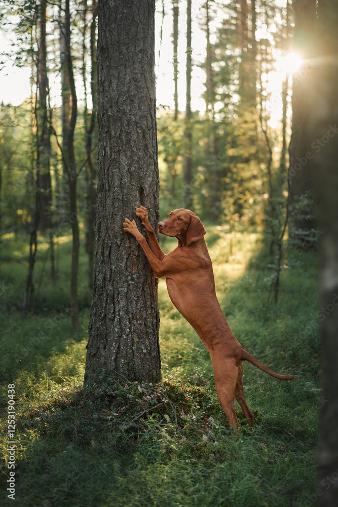 A Hungarian Viszla climbs a tall tree in a dense forest illuminated by golden light. The active pose adds vibrancy and energy to the tranquil setting.