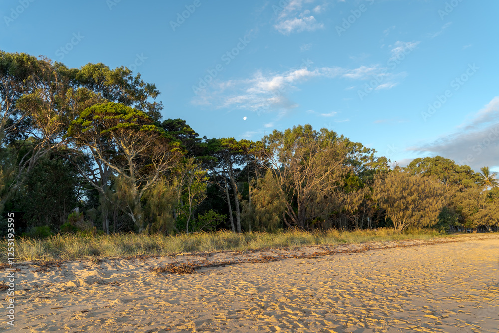Late afternoon light on the beach and trees of the Emerald Fringe. Main Beach, Coochiemudlo Island, Queensland, Australia