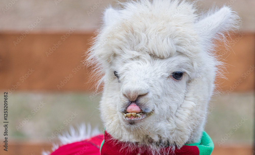 A white llama with a red and green sweater on