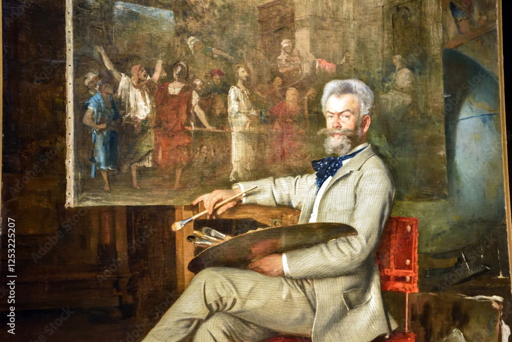 Fine Art Museum in Budapest. Special exhibition: artwork of Hungarian painter Mihaly Munkacsy. Artist at work...