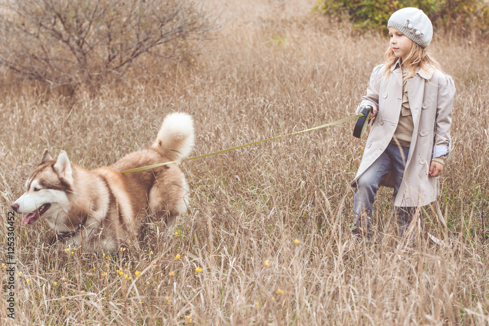 Girl is walking with husky dog