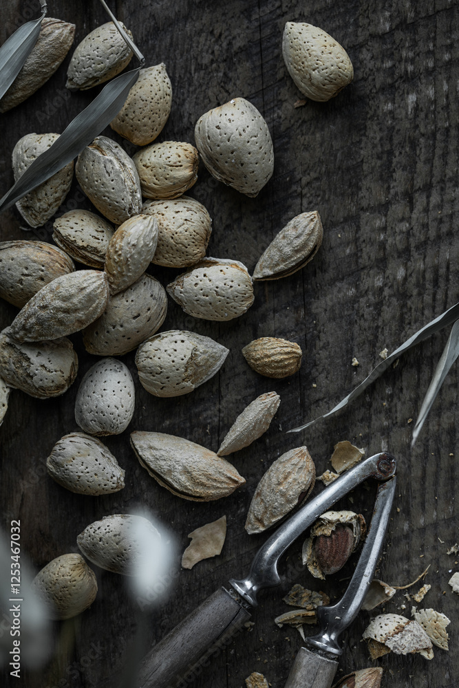 Raw Almonds on a Rustic Wooden Tabe. Shelled almonds as background.