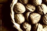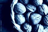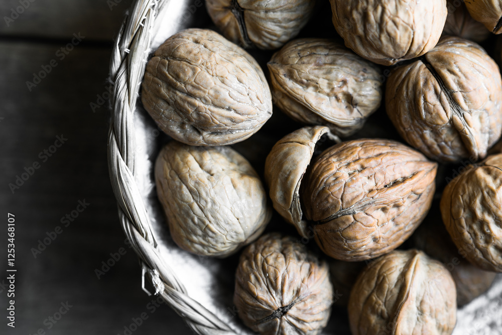Raw walnuts in baskets on wooden Rustic table. Top view.