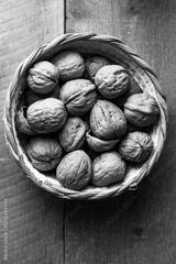 Raw walnuts in baskets on wooden Rustic table. Top view.