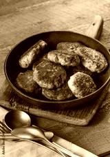 Meatballs. Pork homemade cutlets from minced meat on plate over brown background with copy space. Top view