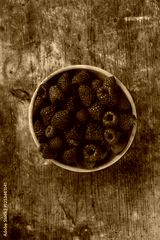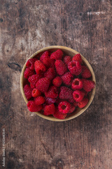 Raspberries in a wooden bowl on a dark wooden table, selective focus.