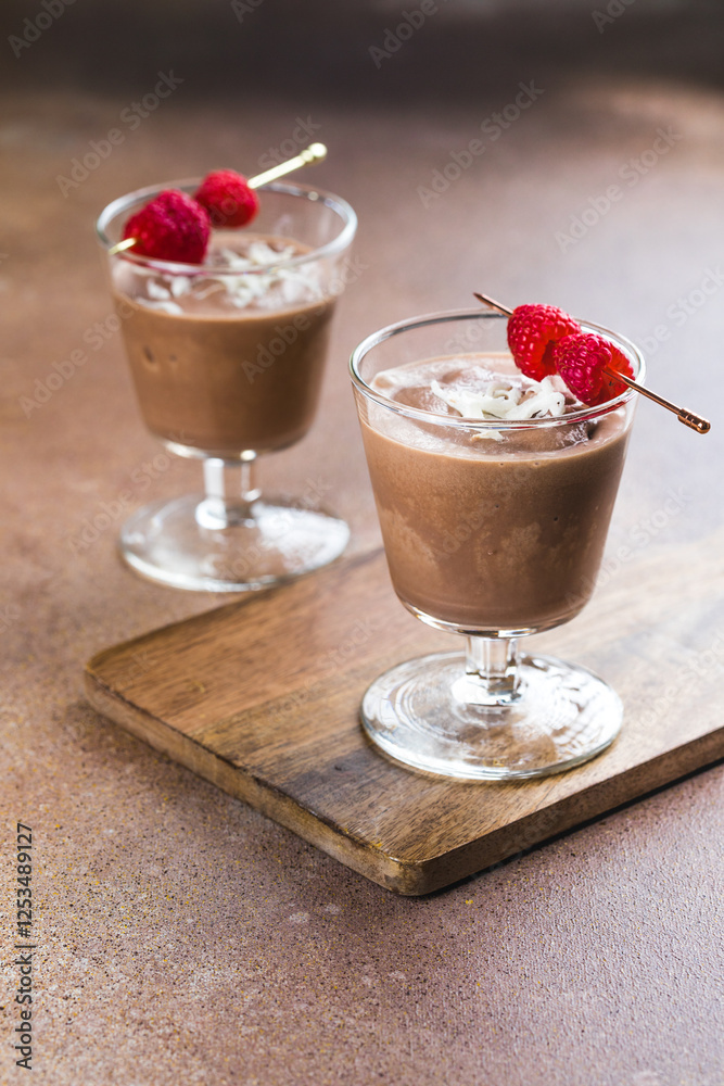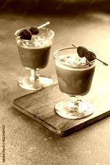 Chocolate dessert panna cotta with almond in glass jars on wooden background
