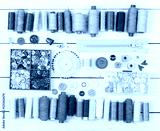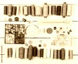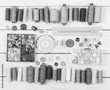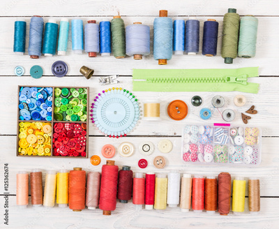 Tools and accessories for sewing on light wooden background.