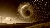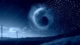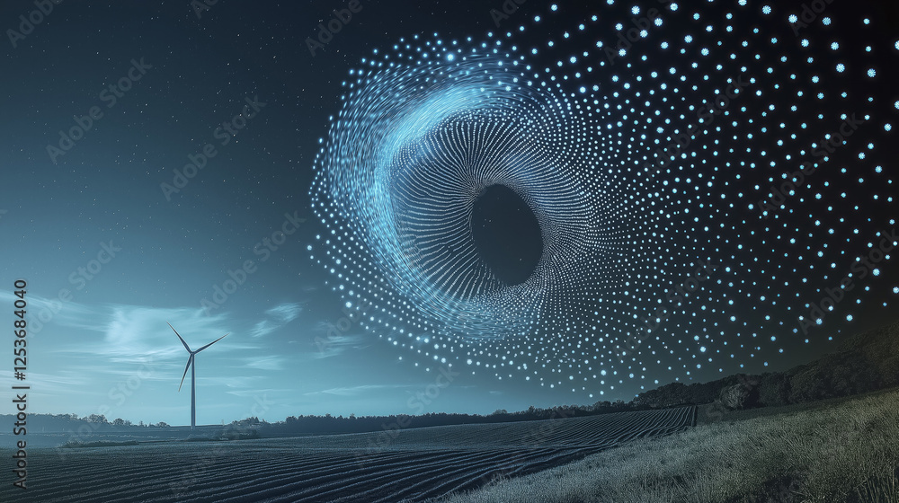 digital dot cascade forms wind turbine in serene landscape, symbolizing innovation and sustainability. night sky enhances futuristic ambiance of scene