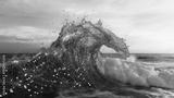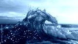 digital wave made of interconnected data points rises against serene ocean backdrop, symbolizing fusion of technology and nature