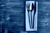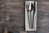 Concept of simple organic food - laconic design cutlery set on rustic wooden table and linen tissue. Top view.