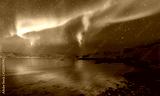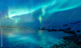 Breaking blue ice over frozen Norwegian Sea - Northern lights or Aurora borealis in the sky over Tromso, Norway
