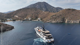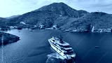 Aerial drone photo of luxury yachts approaching small port of Thimena island untouched by tourism next to Fourni island, North Aegean sea, Greece