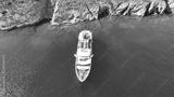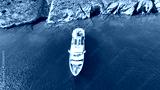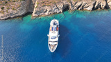 Aerial drone top down photo of luxury exotic yacht stern with wooden deck anchored in paradise turquoise bay